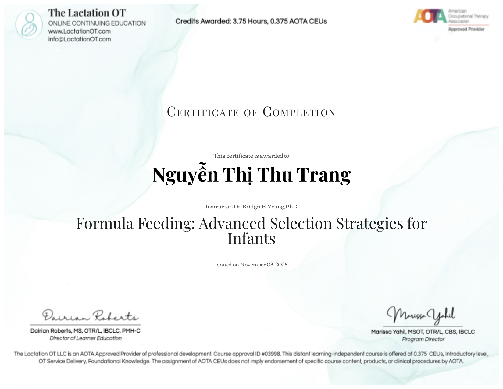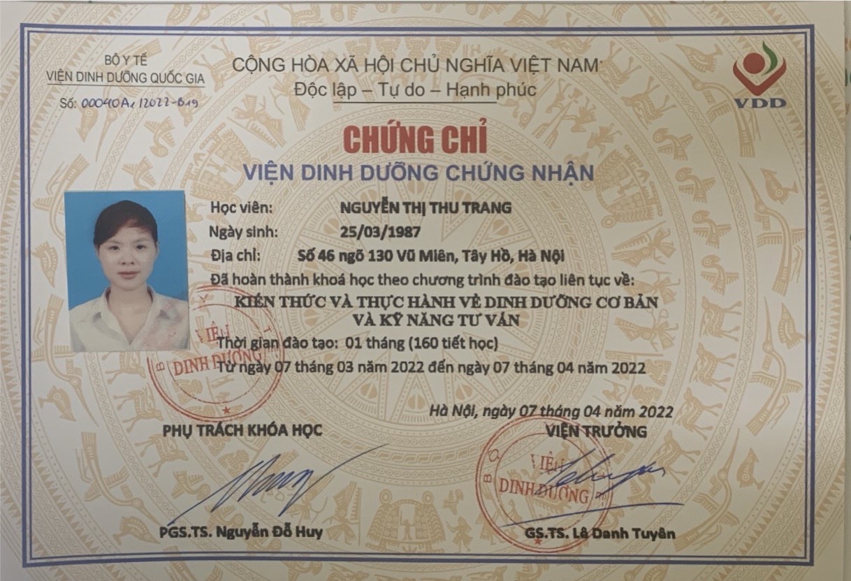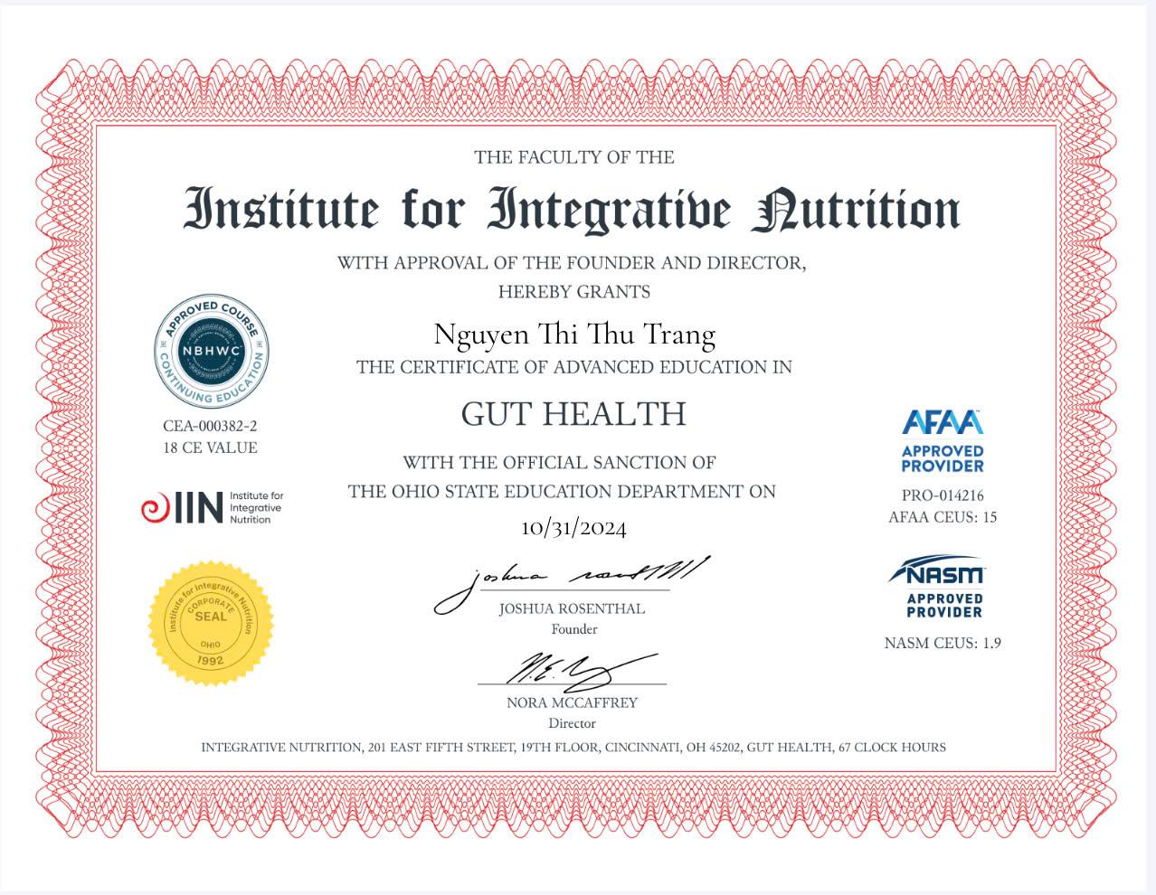 Mình là Cố vấn Dinh dưỡng IIN Hoa Kỳ, đồng thời là Chuyên gia Sữa công thức với nền tảng kiến thức từ nhiều học viện uy tín: IIN – Hoa Kỳ, , cùng các khóa chuyên sâu về dinh dưỡng mẹ & bé từ Lactation OT, Viện dinh dưỡng Quốc gia, cử nhân Dinh Dưỡng – Đại học y tế công cộng, Gut Health Nutritionist…